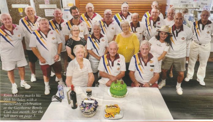 On Monday 17th February Keith Moore a 35-year member of the Gaythorne Bowls Club celebrated his 99th birthday. To mark this milestone, occasion his friends and fellow members put on a small party and cake after social bowls on Wednesday 19th February.